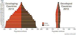 The increase in life expectancy and presence of demographic transition ("bebi-boom" as consequence of reduction of infantile death rate) has led to serious changes of age structure. Changes in more developed countries where the numerous cohort (generated in days of high birth rate) has reached age actively working were especially radical, but will be soon already presented by a considerable quantity of the older persons needing guardianship. At the same time in developing countries the share of children and young men is still very great and the share of old men (fig. 5) is small. See dynamics of change of age structure on fig. 6 (it not model, and the real data on two groups of the countries). If in the African countries to the south of Sahara of the population of 43 % is more younger 15 years, and only 3 % have age is more senior 65 years in the countries of Europe on children and teenagers (till 15 years) 16 % of the population are necessary, and the same of 16 % are made by inhabitants is more senior 65 years.